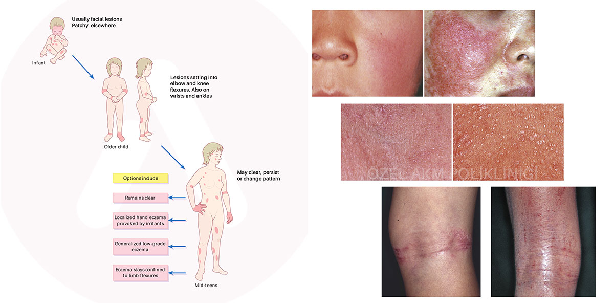 • Deride kuruluk, kızarıklık, kabuklu ve sulantılı yaralar oluşur. Sürekli kaşımaya bağlı deride kalınlaşma görülebilir. Farklı yaşta farklı bölgeler etkilenir. Bebeklerde yanaklar ve boyun, büyük çocuklar ve yetişkinlerde diz-dirsek iç yüzleri ve eller en çok etkilenir.